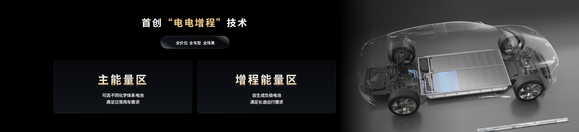 驍遙雙核電池首創(chuàng)的“電電增程”技術,能夠結合車輛的行駛狀態(tài)和用戶駕駛習慣,智能調控兩個能量區(qū)的分配策略。主能量區(qū)可以根據(jù)用戶的駕駛習慣與場景,適配不同化學體系的電芯,滿足日常用車需求;增程能量區(qū)可采用高比能自生成負極技術,提供更大的電量,以滿足用戶的長途出行需求。