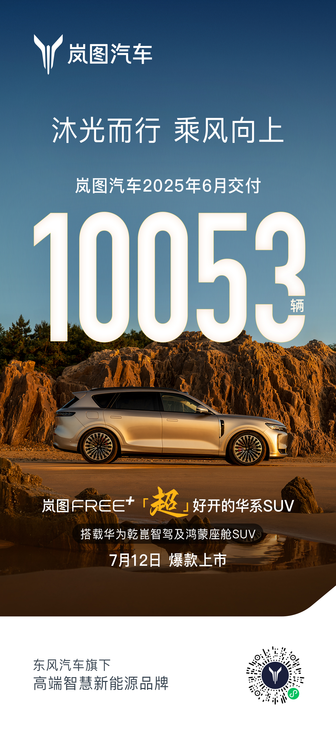 7月1日,嵐圖汽車公布上月銷量數(shù)據(jù)。6月,嵐圖汽車單月銷量達(dá)10053輛,同比增長(zhǎng)83%。1—6月,嵐圖汽車?yán)塾?jì)銷量達(dá)56128輛,同比增長(zhǎng)85%。在高端新能源MPV領(lǐng)域,爆款嵐圖夢(mèng)想家站穩(wěn)冠軍。嵐圖另一款“聽(tīng)勸”的爆款產(chǎn)品,嵐圖FREE+也在火熱預(yù)售中。從強(qiáng)勢(shì)發(fā)展勢(shì)頭來(lái)看,嵐圖“智慧 品位 信賴”的品牌形象已經(jīng)贏得新時(shí)代中堅(jiān)力量認(rèn)可,正在全面鞏固夯實(shí)央國(guó)企高端新能源第一品牌地位。