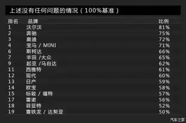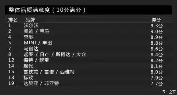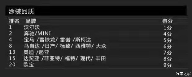 再來看看涂裝品質(zhì)方面,涂裝主要包括車漆亮度與耐腐蝕性。還是老規(guī)矩,得分最低就代表消費者滿意度最高(下同)。沃爾沃的得分為1分,依然占據(jù)榜首的位置,或許排名第二的奔馳為4分,但跟沃爾沃差距有點大。得分最高的則是歐寶,為9分。另外,達契亞也有8分。
