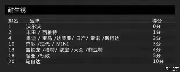 接下來這個項目的得分情況讓小編的心碎了一地,那就是耐生銹品質(zhì)。沃爾沃一如既往的穩(wěn)定,憑借0分的表現(xiàn)力挫群雄,險勝豐田及西雅特這兩個品牌。值得關(guān)注的是,這次的倒數(shù)第一名竟換成了馬自達,日系得了10分實屬少見。本來小編就打算入手一臺阿特茲,看到這個表現(xiàn),立馬變得很猶豫了有木有!生銹,生銹,居然生銹?