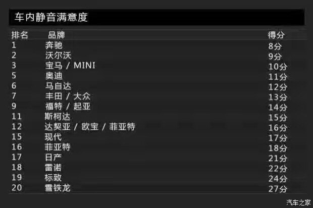 Bild這次調(diào)查的車內(nèi)靜音品質(zhì)上,排名第一的是奔馳,它的得分為8分,而排在第二名的則是沃爾沃,它的得分為9分。寫到這里,小編不得不說:老哥,真穩(wěn),服!滿意度最低的則是雪鐵龍,又是法國車企,Auto