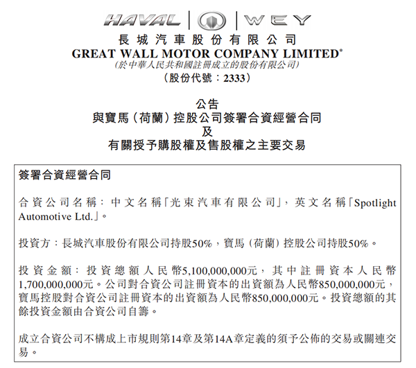 7月10日,長城、寶馬正式簽署合資經(jīng)營合同。兩家公司聯(lián)合出資51億元人民幣,成立注冊(cè)資本為17億元的光束汽車有限公司,注冊(cè)地為江蘇省張家港市。