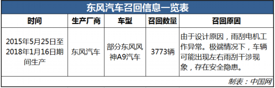 中國網(wǎng)汽車11月4日訊 近日,記者從國家市場監(jiān)督管理總局缺陷產(chǎn)品管理中心官網(wǎng)獲悉,東風(fēng)汽車集團(tuán)股份有限公司乘用車公司向國家市場監(jiān)督管理總局備案了召回計劃,自2019年11月8日起,召回2015年5月25日至2018年1月16日期間生產(chǎn)的部分東風(fēng)風(fēng)神A9汽車,共計3773輛。