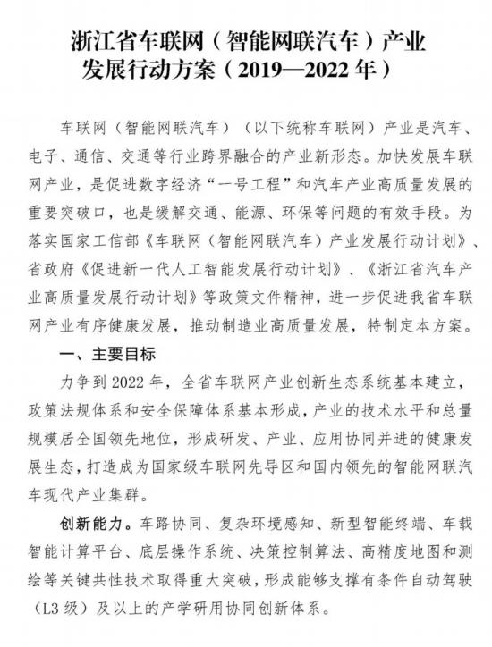 推動智能網(wǎng)聯(lián)發(fā)展的,除了技術,還有政策。“加快發(fā)展智能網(wǎng)聯(lián)產(chǎn)業(yè),是促進數(shù)字經(jīng)濟‘一號工程’和汽車產(chǎn)業(yè)高質(zhì)量發(fā)展的重要突破口,也是緩解交通、能源、環(huán)保等問題的有效手段。”近日,浙江省經(jīng)濟和信息化廳、科技廳、交通運輸廳聯(lián)合印發(fā)《浙江省車聯(lián)網(wǎng)(智能網(wǎng)聯(lián)汽車)產(chǎn)業(yè)發(fā)展行動方案(2019-2022 年)》(以下簡稱《方案》)中所指出的,正是發(fā)展智能網(wǎng)聯(lián)的意義所在。