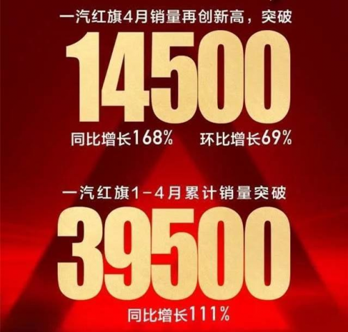 2019年,紅旗品牌累計(jì)銷量突破100000輛大關(guān),同比增長(zhǎng)200%以上,銷量目標(biāo)比計(jì)劃提前了整整一年。然而,今年年初,一場(chǎng)突如其來的疫情,給全球汽車產(chǎn)業(yè)帶來了巨大的沖擊,大部分車企品牌銷量陷入一片下滑之中,而一汽紅旗卻逆勢(shì)而上,實(shí)現(xiàn)了超高增長(zhǎng)。數(shù)據(jù)顯示,紅旗品牌4月份銷量14500輛,同比增長(zhǎng)168%,環(huán)比增長(zhǎng)69%;1—4月累積銷量突破39500輛,同比增長(zhǎng)111%。