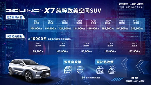另外,北京汽車表示,前1萬名購車用戶還可享受燃油版車型9.59-13.79萬元限時(shí)優(yōu)惠,以及終身保養(yǎng)、終身質(zhì)保、終身基礎(chǔ)流量免費(fèi)等優(yōu)惠政策。