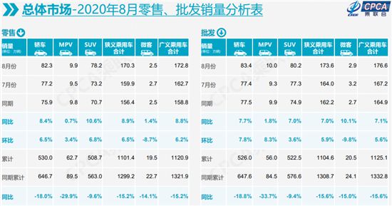 分車(chē)型來(lái)看,8月三大乘用車(chē)市場(chǎng)同環(huán)比均呈增長(zhǎng)態(tài)勢(shì)。其中MPV市場(chǎng)銷(xiāo)量為9.9萬(wàn)輛,同比增長(zhǎng)0.7%,環(huán)比增長(zhǎng)3.4%;轎車(chē)和SUV市場(chǎng)8月銷(xiāo)量分別為82.3萬(wàn)輛和78.2萬(wàn)輛,同比增幅分別為8.4%和10.6%,環(huán)比增幅分別為6.5%和6.8%。1-8月,轎車(chē)、SUV、MPV三大市場(chǎng)累計(jì)銷(xiāo)量分別為530.0萬(wàn)輛、508.7萬(wàn)輛和62.7萬(wàn)輛,同比分別下降18.0%、9.6%和29.9%。