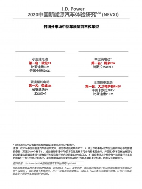 研究結(jié)果顯示,上汽大眾(105 個 PP100)獲得插電混動車市場新車質(zhì)量第一名,寶馬(108個PP100)位列插電混動車市場第二位。蔚來(109 個 PP100)獲得純電動車市場新車質(zhì)量第一名,特斯拉(113個PP100)和歐拉(129個PP100)位列純電動車市場第二和第三位;車型層面,歐拉R1榮獲小型純電動細(xì)分市場第一;榮威Ei5榮獲緊湊型純電動細(xì)分市場第一;蔚來ES6摘得中型純電動細(xì)分市場第一;大眾帕薩特 PHEV 摘得主流插電混動細(xì)分市場第一;豪華插電混動和大型純電動細(xì)分市場因為不滿足細(xì)分市場頒獎條件,因而沒有獎項頒出。