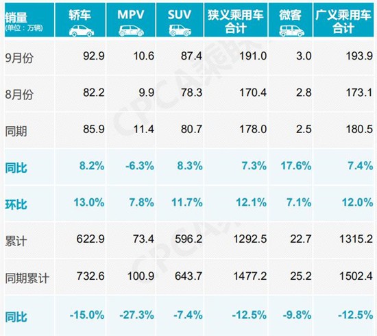 9月,國(guó)內(nèi)狹義乘用車銷量達(dá)到191.0萬(wàn)輛,同比增長(zhǎng)7.3%,三季度較去年同期實(shí)現(xiàn)約38萬(wàn)輛的銷售增量;1-9月累計(jì)銷量增速下滑也收窄至12.5%,較1-8月再提升2.7個(gè)百分點(diǎn)。國(guó)內(nèi)乘用車市場(chǎng)繼續(xù)呈現(xiàn)較強(qiáng)的回暖趨勢(shì)。 三季度的高增速,源于國(guó)內(nèi)宏觀經(jīng)濟(jì)和出口市場(chǎng)回暖超預(yù)期、去年同期較低的銷售基數(shù)、新能源市場(chǎng)的顯著回彈,以及北京車展等對(duì)人氣的匯聚、開(kāi)學(xué)季的到來(lái)和‘雙節(jié)’自駕游需求等諸多因素。 展望10月,雖然工作日比去年同期少兩天,但伴隨國(guó)內(nèi)經(jīng)濟(jì)、消費(fèi)信心持續(xù)恢復(fù),地方政府促銷費(fèi)熱情依舊高漲,加之歷年10月都是旺銷期,因此市場(chǎng)表現(xiàn)仍值得期待。 近日,乘用車市場(chǎng)信息聯(lián)席會(huì)發(fā)布數(shù)據(jù)顯示,9月,國(guó)內(nèi)狹義乘用車銷量達(dá)到191.0萬(wàn)輛,同比增長(zhǎng)7.3%,連續(xù)三個(gè)月保持在8%的較高增長(zhǎng),并較去年同期實(shí)現(xiàn)約38萬(wàn)輛的銷售增量;1-9月累計(jì)銷量增速下滑也收窄至12.5%,較1-8月再提升2.7個(gè)百分點(diǎn)。