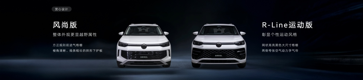 外觀造型上,為滿足當(dāng)下用戶多元化的審美需求,全新探岳L提供兩種前臉設(shè)計。其中,風(fēng)尚版車型的前臉方正且規(guī)則的進氣格柵,輔以棱角清晰、線條粗壯的拱形下護板,整體外觀更顯越野屬性。相比之下,R-Line運動版則采用了品牌標志性的網(wǎng)狀、高亮黑、大尺寸格柵,與兩側(cè)夸張的空氣動力學(xué)氣簾相得益彰,賦予車輛更凌厲氣質(zhì),充分彰顯個性運動風(fēng)格。