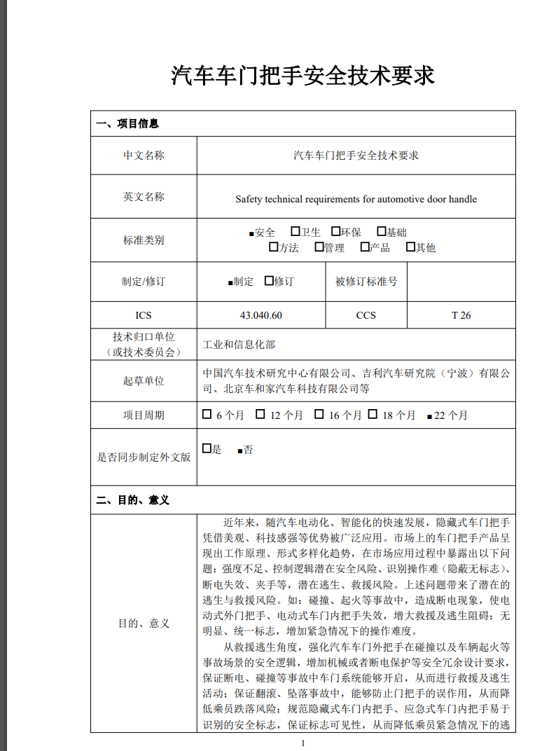 文件中還提到,目前國外暫無隱藏式門把手在布置、標(biāo)志、安全功能、結(jié)構(gòu)強(qiáng)度等方面的技術(shù)要求。