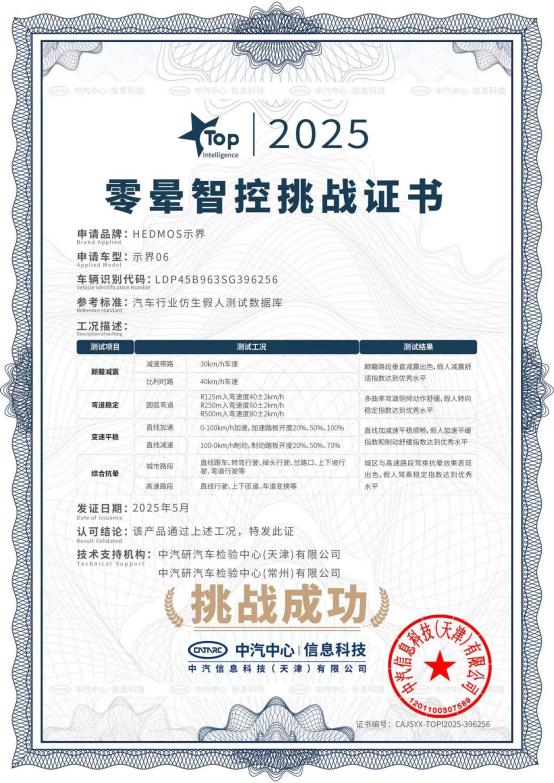 近期,在行業(yè)首次的暈動(dòng)仿生假人零暈智控挑戰(zhàn)中,示界06展現(xiàn)了優(yōu)異的駕控表現(xiàn)。中國汽車研究中心有限公司高級(jí)工程師趙博文在發(fā)布會(huì)現(xiàn)場公布測試數(shù)據(jù)時(shí)指出:“通過精準(zhǔn)的電機(jī)扭矩動(dòng)態(tài)分配、法系底盤調(diào)?;颍约按钶d的‘零暈智控’技術(shù)體系,示界06在六維駕控測試中表現(xiàn)出行業(yè)優(yōu)秀水平?!睖y試結(jié)果顯示,示界06完美實(shí)現(xiàn)了“6不”卓越體驗(yàn):簸路不顛、彎道不飄、加速不竄、減速不抖、駕乘不暈、長途不累,為行業(yè)樹立了駕乘舒適新標(biāo)桿。