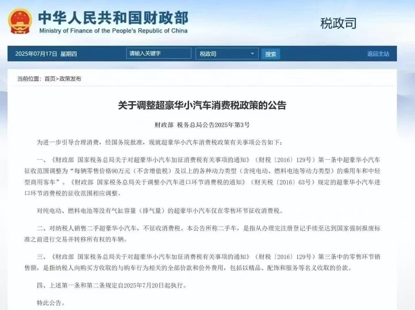 央廣網(wǎng)北京消息(記者董楠)7月17日,財政部、稅務(wù)總局聯(lián)合發(fā)布公告,對超豪華小汽車消費稅政策作出調(diào)整。此次調(diào)整不僅將征稅門檻從130萬元(不含增值稅)降至90萬元,還在征稅環(huán)節(jié)、車型差異、二手車交易等方面做出明確規(guī)范,新政7月20日起正式執(zhí)行。這是2016年我國對超豪華小汽車加征消費稅后的首次調(diào)整。