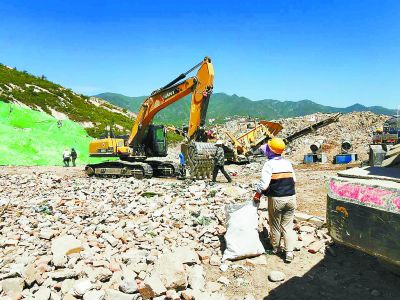 燕山鳳凰亭2號(hào)涵洞黑渣土場上,工人正在對(duì)建筑垃圾與生活垃圾進(jìn)行二次分揀。