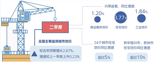 中國國土勘測規(guī)劃院日前發(fā)布的全國主要城市地價(jià)監(jiān)測報(bào)告顯示,二季度全國總體地價(jià)增速微漲。全國主要監(jiān)測城市地價(jià)較去年同期增長2.67%,增速較上一季度上升0.23%。