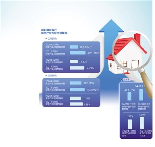 從國(guó)有大行已披露數(shù)據(jù)看,截至2021年6月末,中國(guó)工商銀行、中國(guó)建設(shè)銀行、交通銀行的房地產(chǎn)業(yè)不良貸款余額分別為319.11億元、115.64億元、64.61億元,較去年年末上升156.73億元、25.53億元、17.50億元;房地產(chǎn)業(yè)不良貸款率分別為4.29%、1.56%、1.69%,較去年年末上升1.97個(gè)百分點(diǎn)、0.25個(gè)百分點(diǎn)、0.34個(gè)百分點(diǎn)。