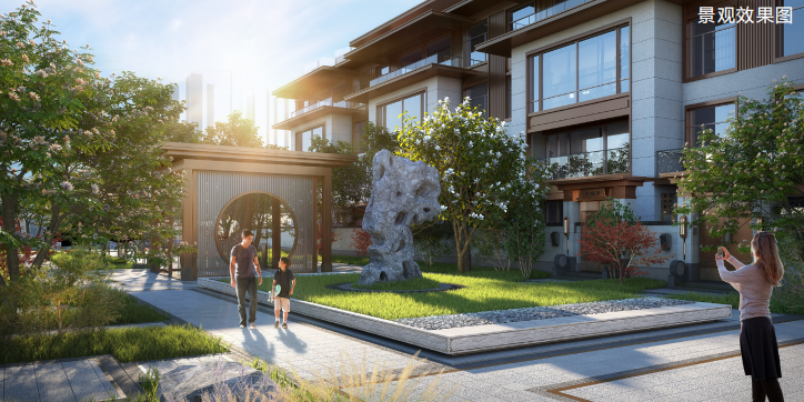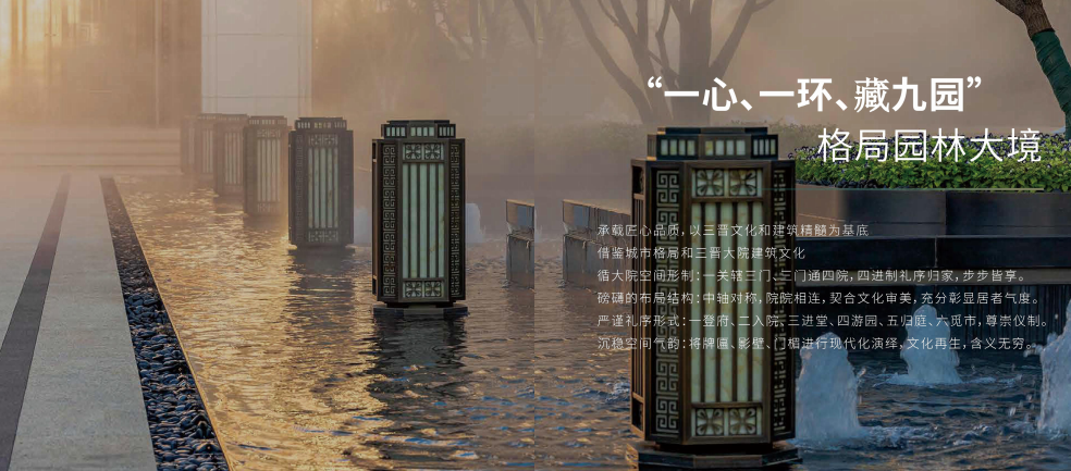 項目整體景觀設計以山林水源,禪意大宅為主線,將江南園林與皇家園林相結合,形成前府后院的園林形態(tài),景觀采用四級九景,四重栽植的造園手法,點綴了九個院落,四十個景點。園林鋪裝精致而具有設計感,在細節(jié)中加入特有的重視吉祥紋樣,更突出了新中式園林的設計風格。