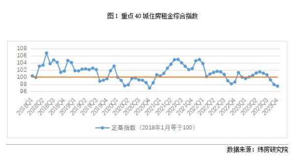 分時(shí)間段來(lái)看,住房租金總體呈現(xiàn)先升后降的趨勢(shì)。受到校畢業(yè)生租房需求增加的影響,住房租金水平波動(dòng)上漲,從2022年末的98.61漲至2023年7月的101.45。隨著需求的釋放,住房租金隨后進(jìn)入下降趨勢(shì),核心40城租金指數(shù)降至2023年末的97.44。2023年末的租金水平與2022年末相比,下降了1.19%。租金水平雖有所下降,但總體穩(wěn)定,未出現(xiàn)大起大落。