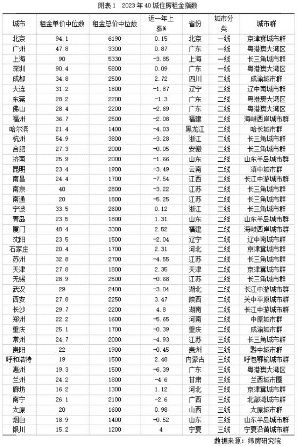 從漲跌結(jié)構(gòu)看,緯房研究院數(shù)據(jù)顯示,2023年重點(diǎn)40城中有15個(gè)城市住房租金同比上漲,其余25個(gè)城市住房租金同比下降。住房租金上漲的城市中,7個(gè)城市漲幅在2%以內(nèi),8個(gè)城市漲幅超過(guò)2%;住房租金下跌的城市中,8個(gè)城市跌幅在2%以內(nèi),9個(gè)城市跌幅在2-4%;8個(gè)城市跌幅超過(guò)4%。