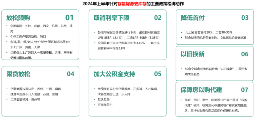 央廣網北京7月2日消息(記者門庭婷)2024年上半年,樓市迎來了一系列政策“組合拳”。年初,《政府工作報告》明確了今年樓市穩(wěn)市場、防風險、促轉型的政策方向;4月30日召開的中央政治局會議為樓市進一步定調,“去庫存”也成為政策的又一發(fā)力點;5月17日,居民信貸政策迎來重大利好,首付比例低至15%、取消房貸利率下限。央行推出再貸款工具支持地方國資收儲存量商品房,各地推進住房“以舊換新”……