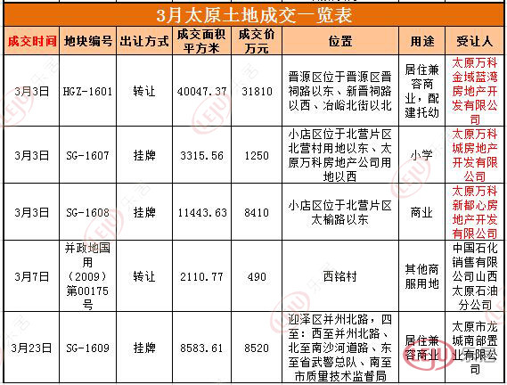 3月份,太原共5宗用地成交,除南沙河南岸一宗商住用地被太原龍城南部置業(yè)有限公司摘得以及一宗國有土地使用權(quán)轉(zhuǎn)讓以外,其余3宗均被萬科摘得,成為本月土地市場(chǎng)的最大看點(diǎn)。