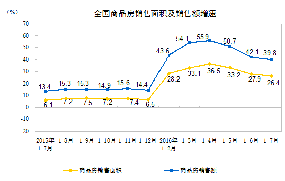 1-7月份,商品房銷售面積75760萬平方米,同比增長26.4%,增速比1-6月份回落1.5個百分點(diǎn)。其中,住宅銷售面積增長26.7%,辦公樓銷售面積增長41.3%,商業(yè)營業(yè)用房銷售面積增長15.5%。商品房銷售額57569億元,增長39.8%,增速回落2.3個百分點(diǎn)。其中,住宅銷售額增長41.2%,辦公樓銷售額增長65.3%,商業(yè)營業(yè)用房銷售額增長17.6%。