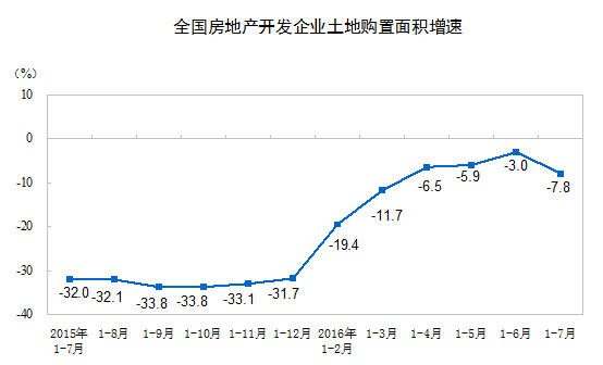 1-7月份,房地產(chǎn)開發(fā)企業(yè)土地購置面積11167萬平方米,同比下降7.8%,降幅比1-6月份擴(kuò)大4.8個百分點(diǎn);土地成交價款3848億元,增長7.1%,增速回落3.1個百分點(diǎn)。