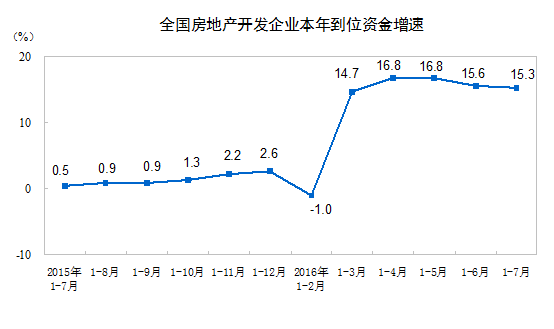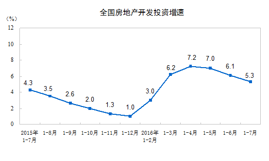 2016年1-7月份,全國房地產(chǎn)開發(fā)投資55361億元,同比名義增長5.3%,增速比1-6月份回落0.8個百分點(diǎn)。其中,住宅投資36981億元,增長4.5%,增速回落1.1個百分點(diǎn)。住宅投資占房地產(chǎn)開發(fā)投資的比重為66.8%。