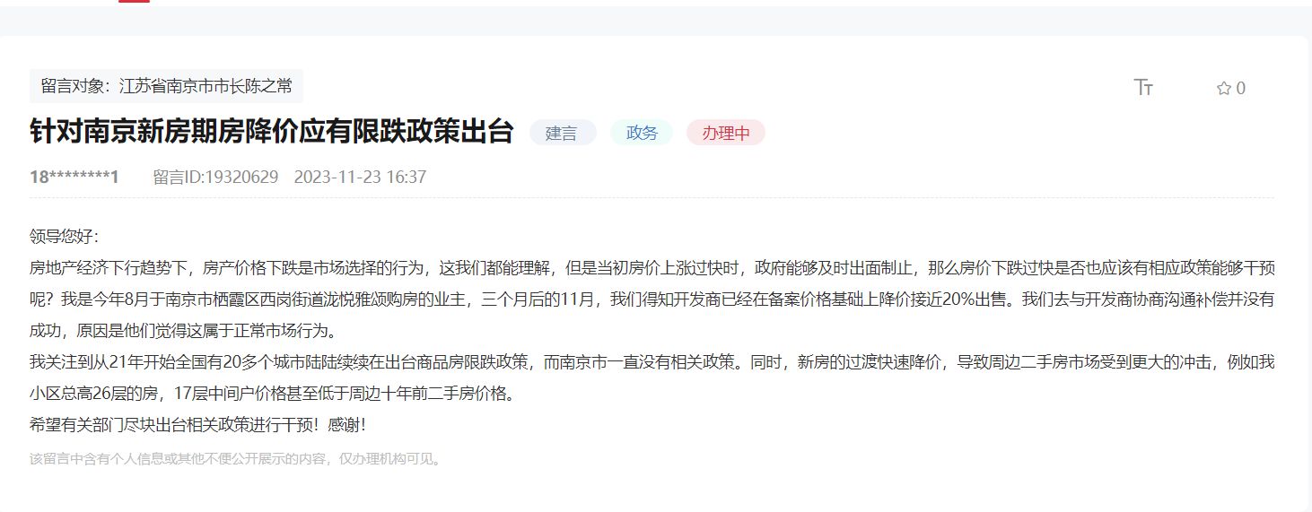 在領(lǐng)導(dǎo)留言板上,11月23日,有網(wǎng)友表示“針對(duì)南京新房期房降價(jià)應(yīng)有限跌政策出臺(tái)”。該網(wǎng)友留言道,“房地產(chǎn)經(jīng)濟(jì)下行趨勢(shì)下,房產(chǎn)價(jià)格下跌是市場選擇的行為,這我們都能理解,但是當(dāng)初房價(jià)上漲過快時(shí),政府能夠及時(shí)出面制止,那么房價(jià)下跌過快是否也應(yīng)該有相應(yīng)政策能夠干預(yù)呢?我是今年8月于南京市棲霞區(qū)西崗街道瀧悅雅頌購房的業(yè)主,3個(gè)月后的11月,我們得知開發(fā)商已經(jīng)在備案價(jià)格基礎(chǔ)上降價(jià)接近20%出售。我們?nèi)ヅc開發(fā)商協(xié)商溝通補(bǔ)償并沒有成功,原因是他們覺得這屬于正常市場行為。 我關(guān)注到從21年開始全國有20多個(gè)城市陸陸續(xù)續(xù)在出臺(tái)商品房限跌政策,而南京市一直沒有相關(guān)政策。同時(shí),新房的過度快速降價(jià),導(dǎo)致周邊二手房市場受到更大的沖擊,例如我小區(qū)總高26層的房,17層中間戶價(jià)格甚至低于周邊十年前二手房價(jià)格?!?/p>