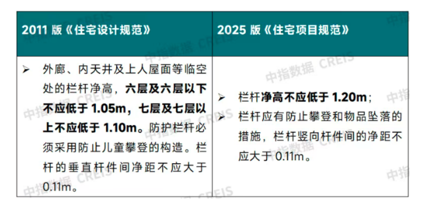 2011版《住宅設(shè)計規(guī)范》按住宅層數(shù)對陽臺欄桿高度提出了不同要求,2022版《住宅項目規(guī)范》(征求意見稿)將陽臺欄桿高度統(tǒng)一調(diào)整為1.1米,2025版新規(guī)再次將這一標(biāo)準(zhǔn)提高至1.2米。