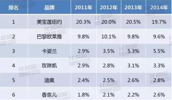 2014年,美寶蓮在中國(guó)的零售額到達(dá)了40億人民幣,而且以遠(yuǎn)超其他品牌的市場(chǎng)占有率穩(wěn)居中國(guó)彩妝市場(chǎng)第一位的位置。但隨著國(guó)內(nèi)本土彩妝的興起及現(xiàn)有彩妝市場(chǎng)的飽和,美寶蓮在經(jīng)歷野蠻生長(zhǎng)期后增長(zhǎng)速度開(kāi)始放緩。
