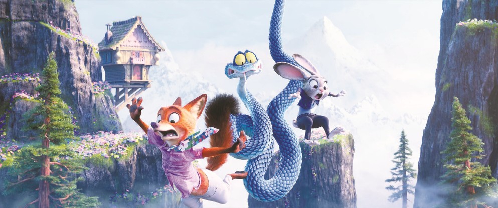 再來看本片另一個貫穿全片的對比結構設計。在《瘋狂動物城2》中,食草動物和食肉動物之間的族群沖突不再出現,更進一步地被擴展至哺乳動物與爬行動物之間的矛盾。很顯然,這里有近年來世界政治局勢動蕩的隱喻——當然觀眾們并沒有必要穿鑿附會地一一去對應。在以氣候墻為核心意象的動物城資源調配體系中,不同動物族群的競爭自然是激烈的,“加速”奔跑依然是社會競爭的外在形態(tài)。在本片中,爬行動物大體被刻畫為競爭的失意者和落寞者,他們只能生活在最蕪雜最混亂的沼澤區(qū),而像蛇這樣的所謂“冷血”族群更要被驅逐在常態(tài)社會之外。