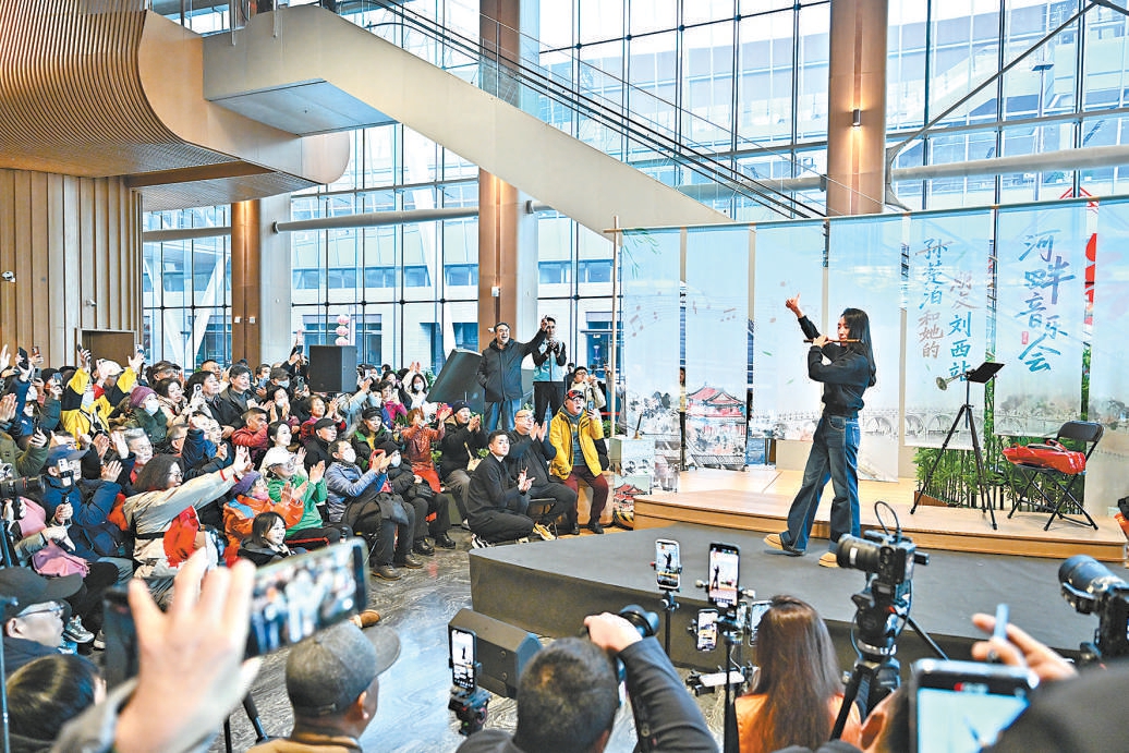 “嗩吶一響,黃金萬(wàn)兩,新的一年,我給大家添添喜氣。”北京民族樂(lè)團(tuán)嗩吶演奏員王向陽(yáng)熟練地向大家問(wèn)了聲好。昨天下午,通州區(qū)遠(yuǎn)洋樂(lè)堤港行人不斷,一段《黃土情》在東區(qū)1層中庭里嘹亮吹響,很快,小舞臺(tái)前便里里外外圍了幾層人,還有不少觀眾放慢腳步,從樓上好奇地向下張望:王向陽(yáng)帶三支嗩吶上臺(tái),《百鳥(niǎo)朝鳳》吹得酣暢淋漓,二胡演奏員孫曉煜弓弦急動(dòng),《賽馬》氣勢(shì)奔騰,竹笛演奏員蔣錦雯用排簫吹起《月亮代表我的心》,溫柔舒展。約一個(gè)小時(shí)的演出,喝彩連連,掌聲不斷,周末時(shí)光被音樂(lè)溫暖點(diǎn)亮。
