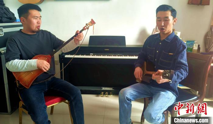 呼麥演員阿力同桑(右)和同事交流呼麥彈唱技法。和靜縣融媒體中心供圖