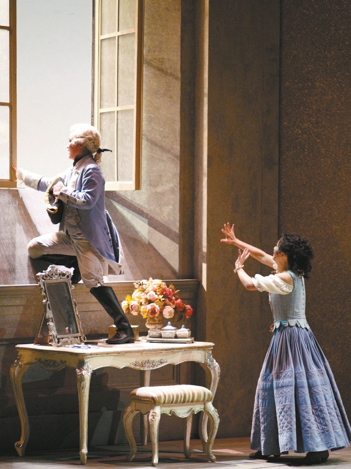 奧地利男中音馬庫(kù)斯·維爾巴飾演的費(fèi)加羅一登場(chǎng)便贏得滿堂喝彩。他以渾厚圓潤(rùn)的音色與精湛的表演技巧,將這位機(jī)智勇敢的男仆形象刻畫得入木三分。在詠嘆調(diào)“如果你想跳舞”中,維爾巴與國(guó)家大劇院合唱團(tuán)的默契配合將劇情推向首個(gè)高潮,合唱團(tuán)飽滿和諧的和聲為音樂增添了絢麗色彩。第一幕結(jié)尾處,維爾巴演唱的著名詠嘆調(diào)“再不要去做情郎”以明快有力的旋律與溫柔勸導(dǎo)的宣敘調(diào)交替呈現(xiàn),生動(dòng)展現(xiàn)了費(fèi)加羅幽默風(fēng)趣與堅(jiān)定勇敢的雙重性格,鏗鏘有力的演唱贏得全場(chǎng)掌聲雷動(dòng)。