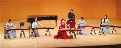 壓軸登場的古箏協(xié)奏曲《紫禁·瑤光》堪稱本場演出視聽亮點(diǎn)。吉煒領(lǐng)奏的團(tuán)隊以傳統(tǒng)箏搭配七聲弦制古箏及復(fù)原古樂器筑、軋箏,在王梓碩的打擊樂配合下,既展現(xiàn)宮廷音樂的風(fēng)雅,又以“玉之光采”頌揚(yáng)君子品格,古樸與創(chuàng)新的融合贏得全場持久掌聲。