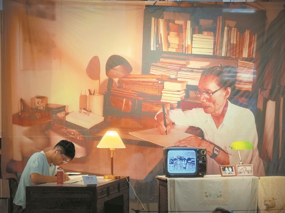 上圖東館手稿主題館展覽現(xiàn)場(chǎng),小讀者在主視覺(jué)區(qū)的仿真書(shū)桌與夏衍“對(duì)坐”。(主辦方供圖)