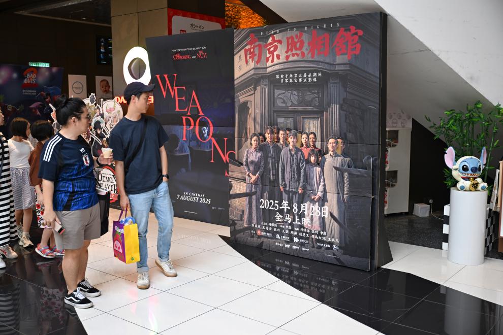 8月24日,在馬來西亞吉隆坡,民眾觀看《南京照相館》電影海報。新華社記者 程一恒 攝