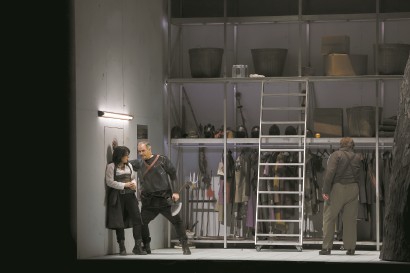 “這一版《女武神》舞美布景充滿哲思?!痹S忠說。舞臺設(shè)計卡爾海因茨·貝爾將《女武神》的舞臺空間形容為“流動的過程”。舞臺上,空間的轉(zhuǎn)換不斷發(fā)生,不同場域在連續(xù)的過渡中彼此連接??此苽鹘y(tǒng)的寫實場景很快被打破,一些場景中許多個空間同時疊加,有時同一空間在不同幕之間重復使用,但狀態(tài)不斷變化。“觀眾只需保持興趣、沉浸感受,便能捕捉每個角色與空間獨有的‘跌落時刻’。”