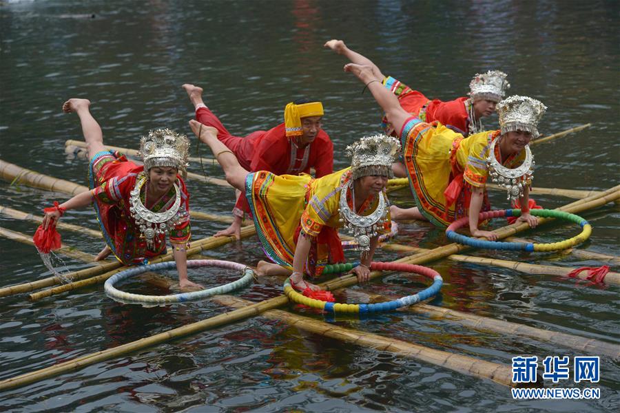 1月1日,“獨竹漂”愛好者在花溪河上表演水上高難度平衡動作。 2016年元旦,在貴陽市花溪公園平橋河段舉行的貴陽市第31屆冬泳表演活動中,數十名“獨竹漂”愛好者在花溪河上腳踏漂浮的竹竿,表演“金雞獨立”、轉身平衡等高難度動作,讓觀眾大飽眼福。新華社發(fā)(秦剛 攝)