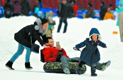 鳥巢主場北側(cè)的歡樂戲雪區(qū)是一片無拘無束的雪海:拉上雪圈繩就能孩子載著爸媽、爸媽載著孩子在雪圈廣場恣意撒歡兒。(記者左穎)