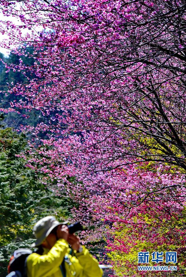 2月29日,游客在武陵農(nóng)場(chǎng)賞花。初春的臺(tái)灣,氣溫回升,位于海拔1700多米的臺(tái)中武陵農(nóng)場(chǎng),漫山遍野的櫻花競(jìng)相開放,美不勝收,吸引了四面八方的游客前來觀賞。 新華社記者張國(guó)俊 攝