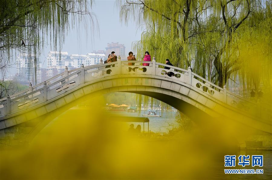 3月17日,山東濟南大明湖畔楊柳吐翠,杏花飄香,市民踏春游湖盡享明媚春光。 新華社記者 郭緒雷 攝