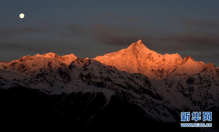 這是3月25日清晨拍攝的梅里雪山“日月同輝”景觀。梅里雪山位于滇藏交界的云南省迪慶藏族自治州德欽縣境內(nèi),是世界自然遺產(chǎn)“三江并流”的主要自然景觀之一。梅里雪山常年云霧籠罩,太陽光只在少數(shù)天晴的清晨照射在雪山頂上,形成絕美的“日照金山”美景。有時(shí)月亮尚未落山,太陽已經(jīng)升起,更是形成了難得一見的梅里雪山“日月同輝”奇觀。新華社記者 王長(zhǎng)山 攝