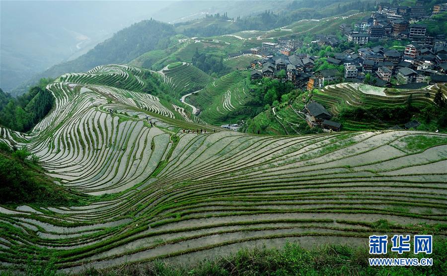 如今,梯田不僅是生存的載體,更已經(jīng)成為一種獨(dú)特的旅游資源,被稱為“地球上最美的曲線”。尤其春天,站在山頂放眼望去,形狀各異的大小梯田盛滿清泉,縱橫交錯(cuò)的田埂如蛛絲一般,農(nóng)民們犁田、砌埂、削壁、灌水, 一個(gè)個(gè)身影點(diǎn)綴在如鏡般的梯田水面上,構(gòu)成了一幅秀麗壯觀、生機(jī)盎然的田園山水畫卷。