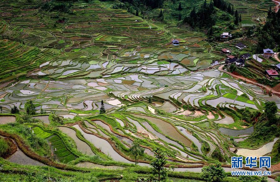 5月20日在廣西柳州市融水苗族自治縣桿洞鄉(xiāng)拍攝的梯田。廣西柳州市融水苗族自治縣桿洞鄉(xiāng)平均海拔780多米,是全縣高海拔鄉(xiāng)鎮(zhèn)之一。這里的梯田多在高山,人們稱之為“天上糧倉”。時下,“天上糧倉”或儲水待插,或新秧初栽,如織錦一般美不勝收。新華社發(fā)(龍濤 攝)