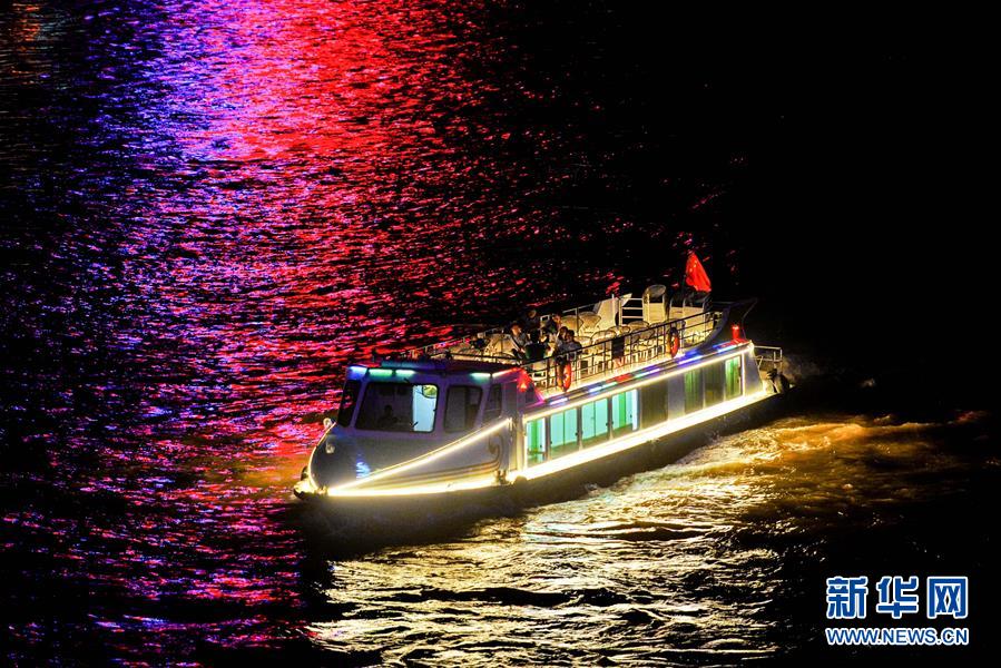 6月14日,一艘游輪從黃河蘭州段中山橋下穿過。自6月12日起,蘭州黃河游輪夏季夜航航線正式開通。據(jù)了解,作為黃河蘭州段水上旅游重點線路,該航線由蘭州市城關(guān)區(qū)蘭州港碼頭和白塔山碼頭始發(fā),每晚20時起開行,全程約6公里,運(yùn)行時長50分鐘左右。游客可以乘坐豪華游輪欣賞黃河夜景,感受蘭州黃河風(fēng)情線別樣魅力。新華社記者 陳斌 攝