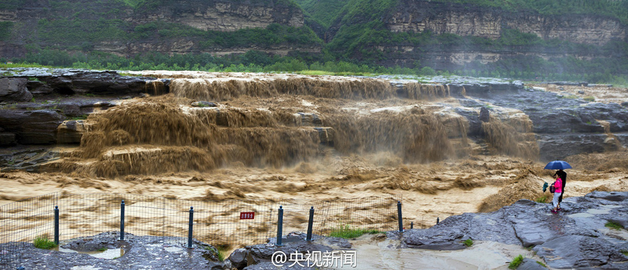 受上游強(qiáng)降雨和水庫(kù)放水影響,最近幾天,黃河壺口瀑布迎來(lái)伏汛,最大水流量達(dá)到每秒2600立方米左右,濁流滾滾奔騰而下,氣勢(shì)磅礴!(央視記者李志 文豪)