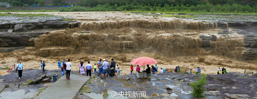 受上游強降雨和水庫放水影響,最近幾天,黃河壺口瀑布迎來伏汛,最大水流量達到每秒2600立方米左右,濁流滾滾奔騰而下,氣勢磅礴!(央視記者李志 文豪)