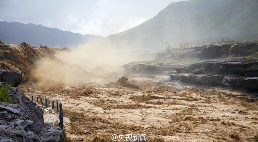 受上游強(qiáng)降雨和水庫放水影響,最近幾天,黃河壺口瀑布迎來伏汛,最大水流量達(dá)到每秒2600立方米左右,濁流滾滾奔騰而下,氣勢磅礴?。ㄑ胍曈浾呃钪?文豪)